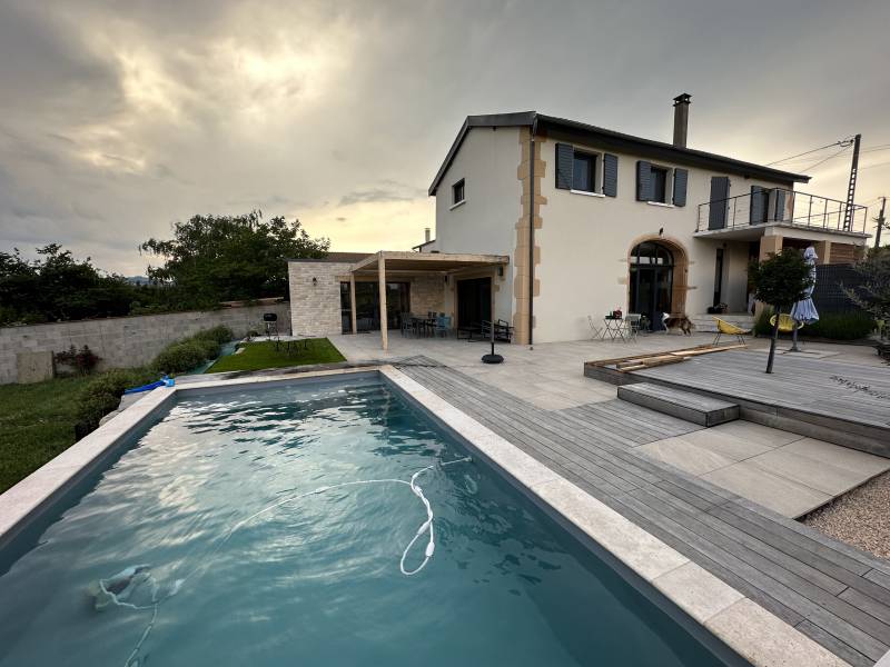 Construction d'une piscine semi-enterrée et réalisation des terrasses.